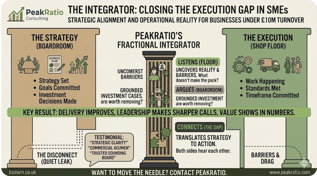 PeakRatio works with founder-led SMEs to provide the integrator function on a fractional basis. Usually a couple of days a month is enough to change the trajectory.